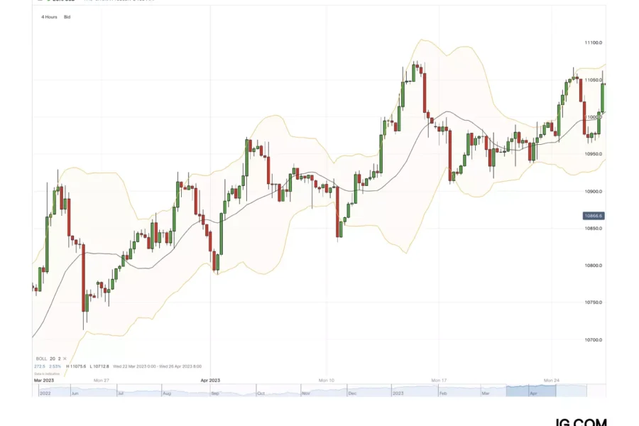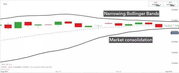 When the upper and lower Bollinger Bands are moving towards each other, or the distance between the upper and lower bands is narrow (on a relative basis), it is a suggestion that the market under review is consolidating.