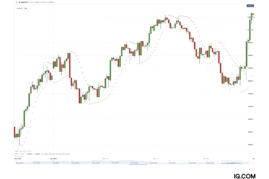 However, many trading platforms – including the IG trading platform – enable you to overlay the parabolic SAR onto any price chart at the click of a button.