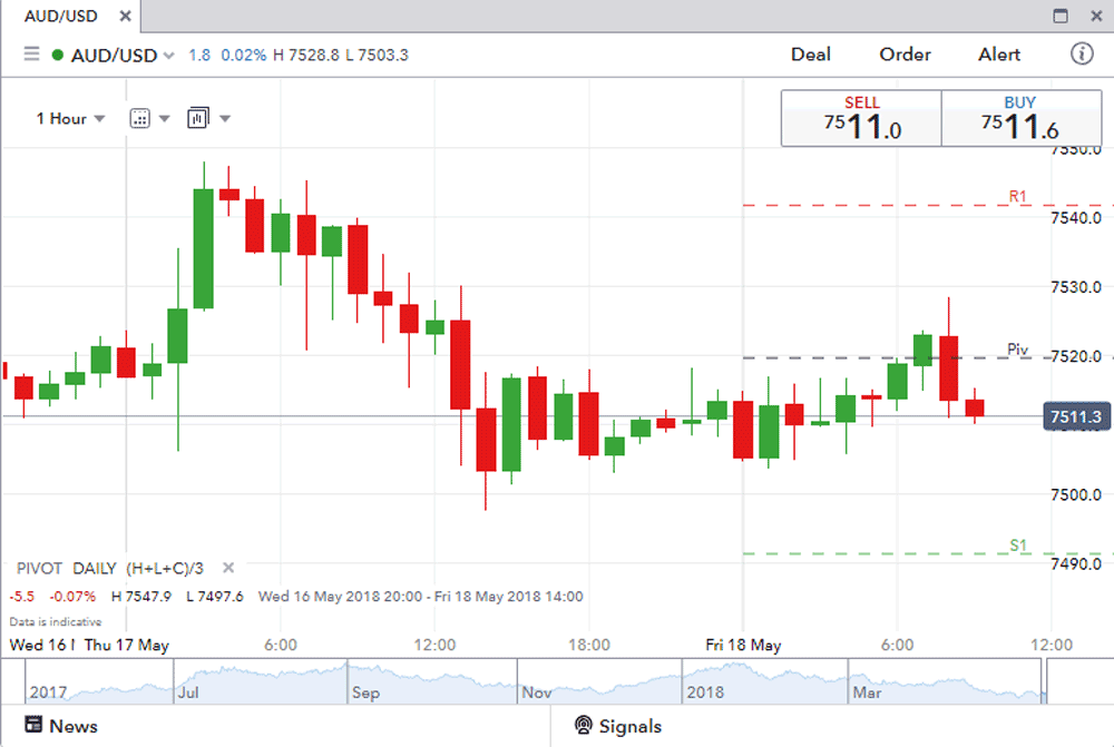 Pivot points can be used with any type of chart, but it is most useful with candlestick charts. This allows you to see price action more effectively. An example can be seen below. In this hourly chart of AUD/USD, the price moved above the central pivot point, but then fell back below it and posted an hourly close below it. This could provide a possible short position, indicating that the price cannot hold support around the daily pivot.