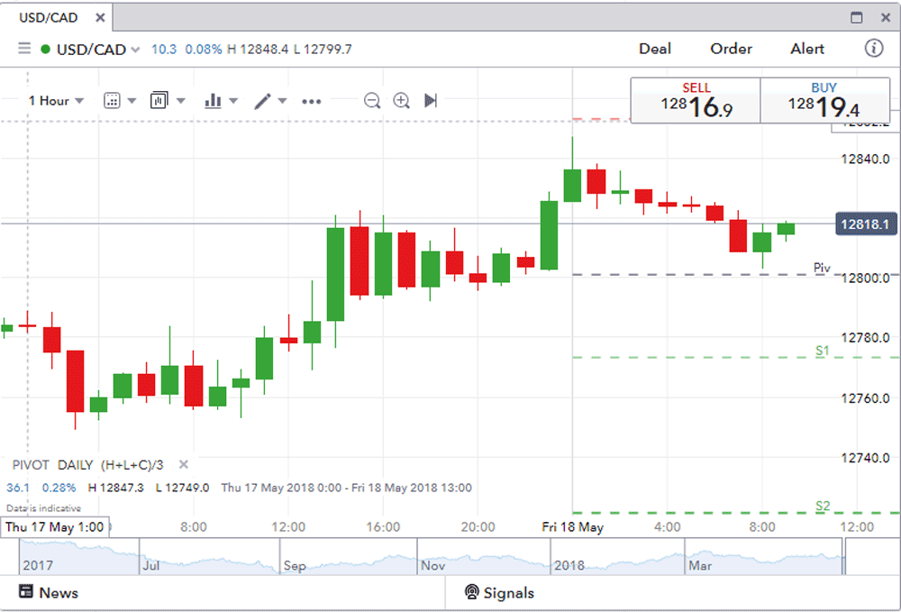 By contrast, in the following example, the price has bounced from near the daily pivot on this hourly USD/CAD chart, suggesting that buyers may push the price higher and see the R1 resistance point challenged: